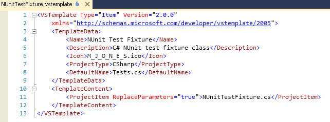 - Line 11 defines the single item of this template, the code template. I'll show later how to package the template so that these files are available to Visual Studio. The TemplateContent element defines a file that makes up part of the template - in this example there's just one element for the code file NUnitTestFixture.cs. If there was e.g. a help file, a resource file, a designer etc, these would each have a separate TemplateContent element. In the element in the example, the ReplaceParameters attribute indicates that placeholders in the file can be replaced with variables.
